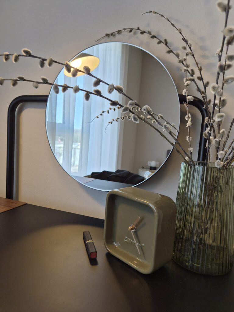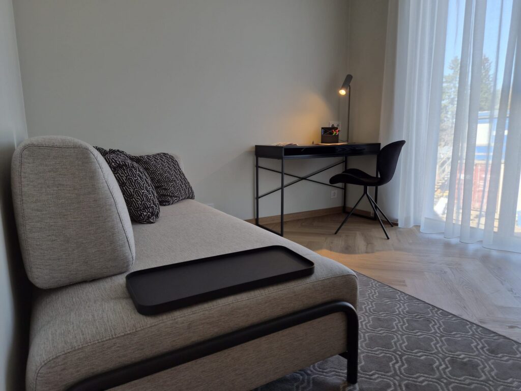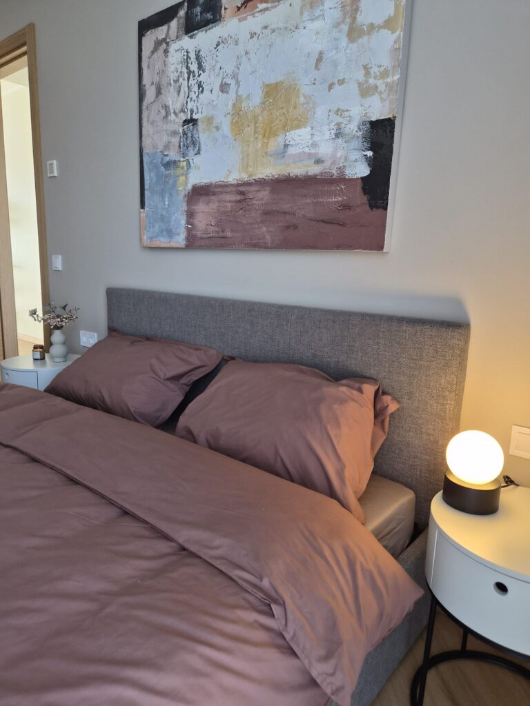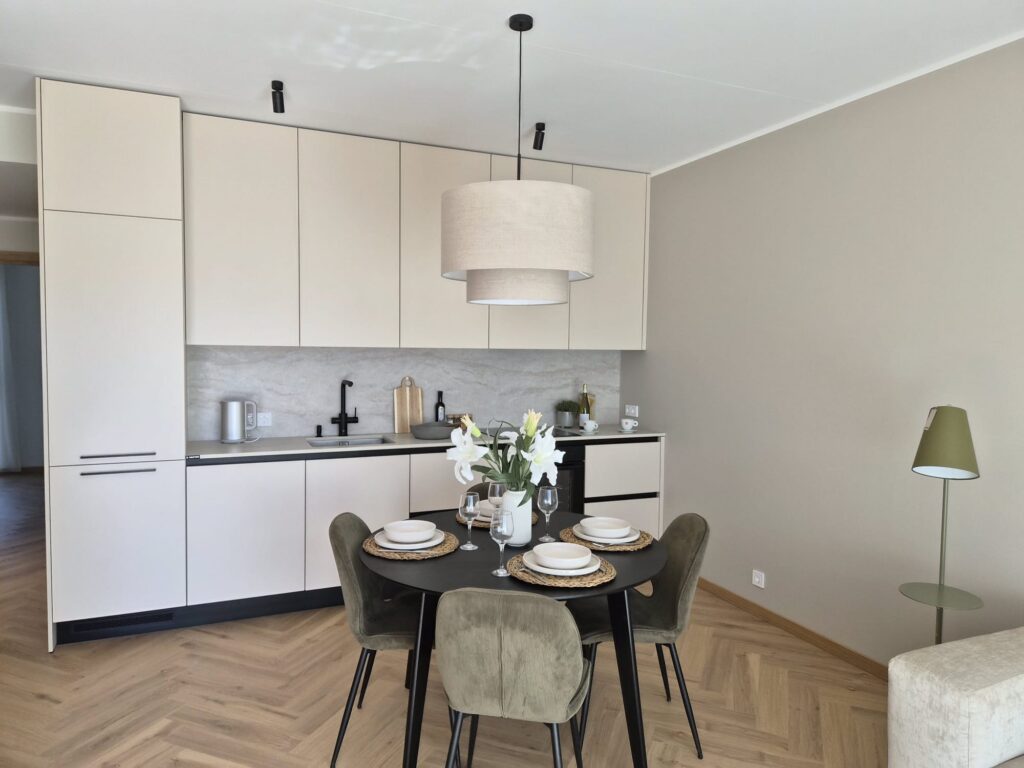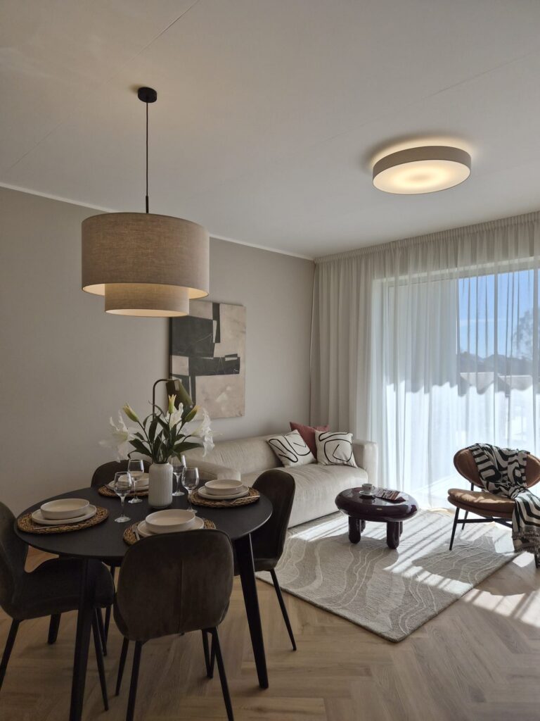 Mums bija iespēja gūt lielisku pieredzi radot demo dzīvokli Muunas objektā! Dzīvokli mums uzticēja ar apabeigtu apdari – grīdas, sienas un santehnika. Pārējais jau bija mūsu dizaineres un projektu vadītājas rokās. Ar sadarbības partneriem radījām funkcionālu virtuvi un ietilpīgus skapjus, kas rasēti pēc telpu specifikas, toņus izvēloties pieskaņojoties dzīvokļa gaišajai gammai. Guļamistabas iekārtotas ar ērtām un praktiskām mēbelēm, vienu radot kā galveno guļamistabu ar divguļamo gultu un naktskapīšiem, mājīgos toņu akcentos. Otra iekārtota kā kabinets, bet noteikti varētu kalpot ka bērnistaba nākotnē.
