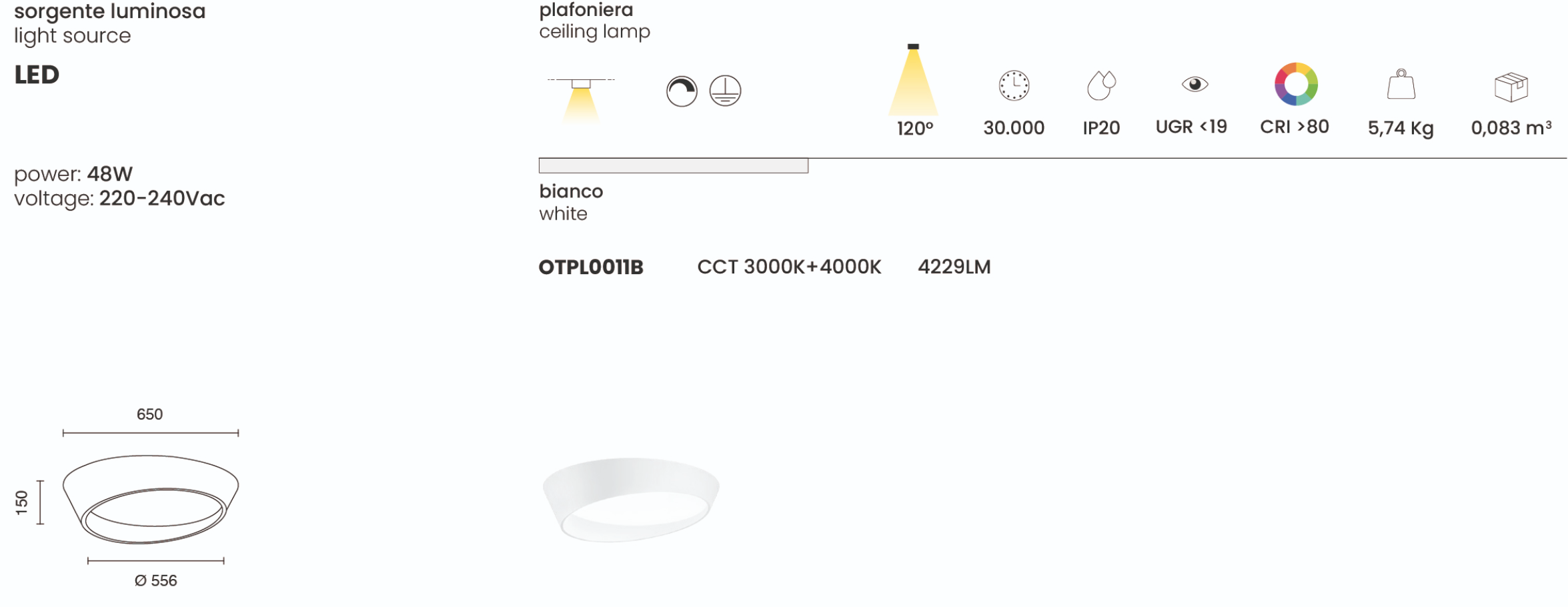 Mūsdienīgs griestu Led gasmeklis balta krāsā. Tam ir Led kam var izvelēties pektru starp silti baltu un baltu gaismu, ka aŗī tas ir dimējams. Tam ir laba gaismas atdeve un lielisksi izgaismos telpu līdz 20m²