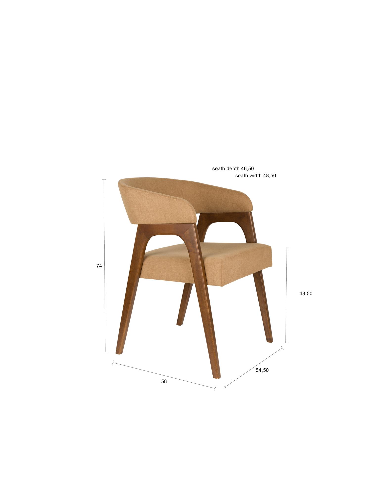 Stabils un ērts ēdamistabas krēsls ar roku balstiem retro noskaņās. Smilškrāsas audums un valrieksta toņa krēsla kājas rada mājīgu koptēlu, lai padarītu interjeru siltāku.
